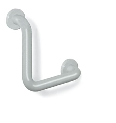 Winkelgriff der Serie 801 - senkrecht und waagerecht angeordnete, im rechten Winkel verbundene Stangen mit Stahl-Befestigungsrosetten - dient zum Festhalten und Abstützen - mit durchgehendem, korrosionsgeschütztem Stahlkern - waagerechte Länge 255 mm, senkrechte Länge 255 mm - 89 mm tief, lichter Abstand zur Wand 56 mm, Stangendurchmesser 33 mm, Rosettendurchmesser 70 mm - Montage an der Wand mit wandspezifischem Befestigungsmaterial und Rosetten von HEWI - links- und rechtsseitig montierbar - aus hochglänzendem Polyamid in allen HEWI Farben - Aufrüstsatz WC-Papierhalter 801.50.011 und Aufrüstsatz WC-Spülauslösung (Funk) 801.50.060 nachrüstbar - in HEWI Farbe 55 (Aquablau)