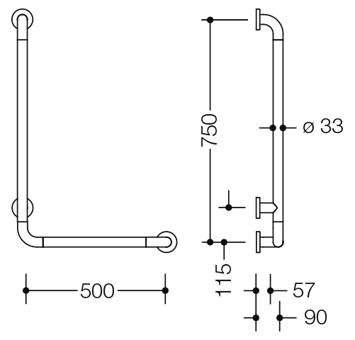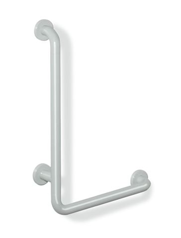 Winkelgriff der Serie 801 - senkrecht und waagerecht angeordnete, im rechten Winkel verbundene Stangen mit Kunststoff-Befestigungsrosetten - dient zum Festhalten und Abstützen - mit Aluminium-/Stahlkern und edelstahlverstärkten Endbögen - waagerechte Länge 500 mm, senkrechte Länge 750 mm - 91 mm tief, lichter Abstand zur Wand 58 mm, Stangendurchmesser 33 mm, Rosettendurchmesser 70 mm - Montage an der Wand mit wandspezifischem Befestigungsmaterial und Rosetten von HEWI - links- und rechtsseitig montierbar - aus hochglänzendem Polyamid in allen HEWI Farben - Aufrüstsatz WC-Papierhalter 801.50.011 und Aufrüstsatz WC-Spülauslösung (Funk) 801.50.060 nachrüstbar - in HEWI Farbe 97 (Lichtgrau)