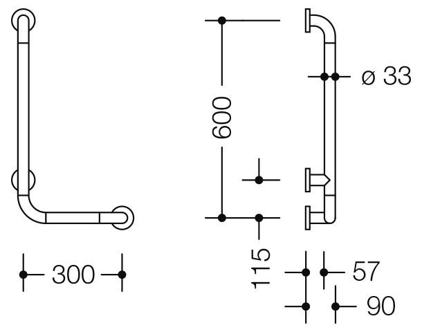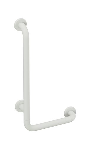 Winkelgriff der Serie 801 - senkrecht und waagerecht angeordnete, im rechten Winkel verbundene Stangen mit Kunststoff-Befestigungsrosetten - dient zum Festhalten und Abstützen - mit Aluminium-/Stahlkern und edelstahlverstärkten Endbögen - waagerechte Länge 300 mm, senkrechte Länge 600 mm - 91 mm tief, lichter Abstand zur Wand 58 mm, Stangendurchmesser 33 mm, Rosettendurchmesser 70 mm - Montage an der Wand mit wandspezifischem Befestigungsmaterial und Rosetten von HEWI - links- und rechtsseitig montierbar - aus mattem Polyamid in den HEWI Farben 99 (Reinweiß), 98 (Signalweiß), 97 (Lichtgrau), 95 (Felsgrau) und 92 (Anthrazitgrau) - Aufrüstsatz WC-Papierhalter 801.50B011 und Aufrüstsatz WC-Spülauslösung (Funk) 801.50B060 nachrüstbar - in HEWI Farbe 97 (Lichtgrau)