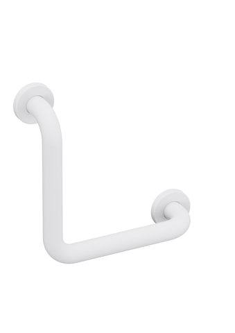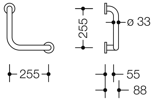 Winkelgriff der Serie 801 - senkrecht und waagerecht angeordnete, im rechten Winkel verbundene Stangen mit Stahl-Befestigungsrosetten - dient zum Festhalten und Abstützen - mit durchgehendem, korrosionsgeschütztem Stahlkern - waagerechte Länge 255 mm, senkrechte Länge 255 mm - 89 mm tief, lichter Abstand zur Wand 56 mm, Stangendurchmesser 33 mm, Rosettendurchmesser 70 mm - Montage an der Wand mit wandspezifischem Befestigungsmaterial und Rosetten von HEWI - links- und rechtsseitig montierbar - aus mattem Polyamid in den HEWI Farben 99 (Reinweiß), 98 (Signalweiß), 97 (Lichtgrau), 95 (Felsgrau) und 92 (Anthrazitgrau) - Aufrüstsatz WC-Papierhalter 801.50B011 und Aufrüstsatz WC-Spülauslösung (Funk) 801.50B060 nachrüstbar - in HEWI Farbe 98 (Signalweiß)