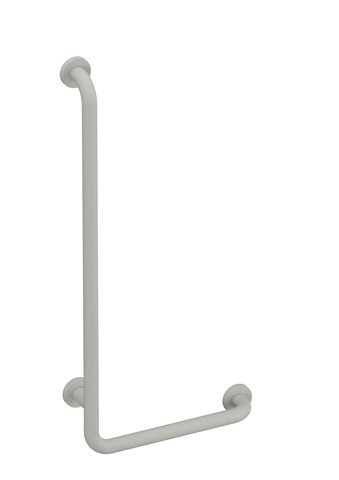 Winkelgriff der Serie 801 - senkrecht und waagerecht angeordnete, im rechten Winkel verbundene Stangen mit Stahl-Befestigungsrosetten - dient zum Festhalten und Abstützen - mit durchgehendem, korrosionsgeschütztem Stahlkern - waagerechte Länge 400 mm, senkrechte Länge 900 mm - 89 mm tief, lichter Abstand zur Wand 56 mm, Stangendurchmesser 33 mm, Rosettendurchmesser 70 mm - Montage an der Wand mit wandspezifischem Befestigungsmaterial und Rosetten von HEWI - links- und rechtsseitig montierbar - aus mattem Polyamid in den HEWI Farben 99 (Reinweiß), 98 (Signalweiß), 97 (Lichtgrau), 95 (Felsgrau) und 92 (Anthrazitgrau) - Aufrüstsatz WC-Papierhalter 801.50B011 und Aufrüstsatz WC-Spülauslösung (Funk) 801.50B060 nachrüstbar - in HEWI Farbe 95 (Felsgrau)