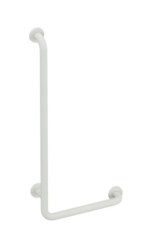 Winkelgriff der Serie 801 - senkrecht und waagerecht angeordnete, im rechten Winkel verbundene Stangen mit Stahl-Befestigungsrosetten - dient zum Festhalten und Abstützen - mit durchgehendem, korrosionsgeschütztem Stahlkern - waagerechte Länge 400 mm, senkrechte Länge 900 mm - 89 mm tief, lichter Abstand zur Wand 56 mm, Stangendurchmesser 33 mm, Rosettendurchmesser 70 mm - Montage an der Wand mit wandspezifischem Befestigungsmaterial und Rosetten von HEWI - links- und rechtsseitig montierbar - aus mattem Polyamid in den HEWI Farben 99 (Reinweiß), 98 (Signalweiß), 97 (Lichtgrau), 95 (Felsgrau) und 92 (Anthrazitgrau) - Aufrüstsatz WC-Papierhalter 801.50B011 und Aufrüstsatz WC-Spülauslösung (Funk) 801.50B060 nachrüstbar - in HEWI Farbe 97 (Lichtgrau)