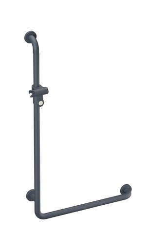 Winkelgriff mit Brausehalter der Serie 801 - senkrecht und waagerecht angeordnete, im rechten Winkel verbundene Stangen mit Stahl-Befestigungsrosetten und Brausehalter - dient im Dusch- und Wannenbereich zum Festhalten und Abstützen - senkrechte Länge auf Maß gefertigt von 600 mm bis 1250 mm, waagerechte Länge auf Maß gefertigt von 300 mm bis 850 mm - 89 mm tief, lichter Abstand zur Wand 56 mm, Stangendurchmesser 33 mm, Rosettendurchmesser 70 mm - geeignet für Handbrausen verschiedener Hersteller - Brausehalter kann stufenlos geneigt und nach Ziehen oder Drücken eines großflächigen Hebels in der Höhe verstellt werden - Funktionsbereich des Brausehalters in hochwertigem, glänzendem Polyamid - konische Aufnahme am Brausehalter erleichtert das Einhängen der Handbrause - mit durchgehendem, korrosionsgeschütztem Stahlkern - Montage an der Wand mit wandspezifischem Befestigungsmaterial und Rosetten von HEWI - links- und rechtsseitig montierbar - aus mattem Polyamid in den HEWI Farben 99 (Reinweiß), 98 (Signalweiß), 97 (Lichtgrau), 95 (Felsgrau) und 92 (Anthrazitgrau) - Bei Verwendung mit Einhängesitzen bitte beachten: Prüfung der Kompatibilität erforderlich. - Eine detaillierte Auflistung der Kombinationsmöglichkeiten von Haltegriffen, Winkelgriffen und Duschhandläufen mit passenden Einhängesitzen finden Sie in unserem Online-Katalog im Download-Bereich des jeweiligen Produktes. - in HEWI Farbe 98 (Signalweiß)