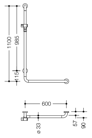 Winkelgriff mit Brausehalter der Serie 801 - senkrecht und waagerecht angeordnete, im rechten Winkel verbundene Stangen mit Kunststoff-Befestigungsrosetten und Brausehalter - dient im Dusch- und Wannenbereich zum Festhalten und Abstützen - senkrechte Länge 1100 mm, waagerechte Länge 600 mm - 91 mm tief, lichter Abstand zur Wand 58 mm, Stangendurchmesser 33 mm, Rosettendurchmesser 70 mm - geeignet für Handbrausen verschiedener Hersteller - Brausehalter kann stufenlos geneigt und nach Ziehen oder Drücken eines großflächigen Hebels in der Höhe verstellt werden - konische Aufnahme am Brausehalter erleichtert das Einhängen der Handbrause - mit Aluminium-/Stahlkern und edelstahlverstärkten Endbögen - Montage an der Wand mit wandspezifischem Befestigungsmaterial und Rosetten von HEWI - links- und rechtsseitig montierbar - aus hochglänzendem Polyamid in allen HEWI Farben - erfüllt die Anforderungen nach ÖNORM B1600/1601 und SIA 500 - Bei Verwendung mit Einhängesitzen bitte beachten: Prüfung der Kompatibilität erforderlich. - Eine detaillierte Auflistung der Kombinationsmöglichkeiten von Haltegriffen, Winkelgriffen und Duschhandläufen mit passenden Einhängesitzen finden Sie in unserem Online-Katalog im Download-Bereich des jeweiligen Produktes. - in HEWI Farbe 84 (Umbra)