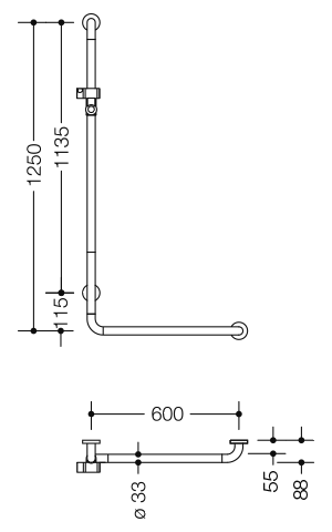 Winkelgriff mit Brausehalter der Serie 801 - senkrecht und waagerecht angeordnete, im rechten Winkel verbundene Stangen mit Stahl-Befestigungsrosetten und Brausehalter - dient im Dusch- und Wannenbereich zum Festhalten und Abstützen - senkrechte Länge 1250 mm, waagerechte Länge 600 mm - 89 mm tief, lichter Abstand zur Wand 56 mm, Stangendurchmesser 33 mm, Rosettendurchmesser 70 mm - geeignet für Handbrausen verschiedener Hersteller - Brausehalter kann stufenlos geneigt und nach Ziehen oder Drücken eines großflächigen Hebels in der Höhe verstellt werden - konische Aufnahme am Brausehalter erleichtert das Einhängen der Handbrause - mit durchgehendem, korrosionsgeschütztem Stahlkern - Montage an der Wand mit wandspezifischem Befestigungsmaterial und Rosetten von HEWI - links- und rechtsseitig montierbar - aus hochglänzendem Polyamid in allen HEWI Farben - erfüllt die Anforderungen nach ÖNORM B1600/1601 und SIA 500 - Bei Verwendung mit Einhängesitzen bitte beachten: Prüfung der Kompatibilität erforderlich. - Eine detaillierte Auflistung der Kombinationsmöglichkeiten von Haltegriffen, Winkelgriffen und Duschhandläufen mit passenden Einhängesitzen finden Sie in unserem Online-Katalog im Download-Bereich des jeweiligen Produktes. - in HEWI Farbe 50 (Stahlblau)