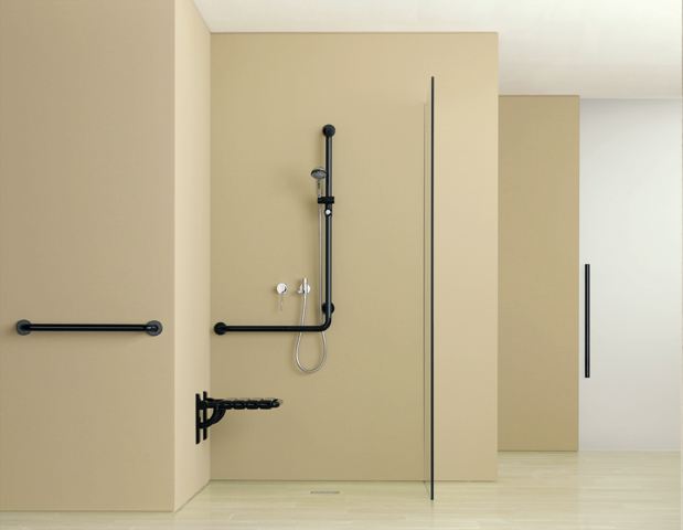Winkelgriff mit Brausehalter der Serie 801 - senkrecht und waagerecht angeordnete, im rechten Winkel verbundene Stangen mit Stahl-Befestigungsrosetten und Brausehalter - dient im Dusch- und Wannenbereich zum Festhalten und Abstützen - senkrechte Länge auf Maß gefertigt von 600 mm bis 1250 mm, waagerechte Länge auf Maß gefertigt von 300 mm bis 850 mm - 89 mm tief, lichter Abstand zur Wand 56 mm, Stangendurchmesser 33 mm, Rosettendurchmesser 70 mm - geeignet für Handbrausen verschiedener Hersteller - Brausehalter kann stufenlos geneigt und nach Ziehen oder Drücken eines großflächigen Hebels in der Höhe verstellt werden - konische Aufnahme am Brausehalter erleichtert das Einhängen der Handbrause - mit durchgehendem, korrosionsgeschütztem Stahlkern - Montage an der Wand mit wandspezifischem Befestigungsmaterial und Rosetten von HEWI - links- und rechtsseitig montierbar - aus hochglänzendem Polyamid in allen HEWI Farben - Bei Verwendung mit Einhängesitzen bitte beachten: Prüfung der Kompatibilität erforderlich. - Eine detaillierte Auflistung der Kombinationsmöglichkeiten von Haltegriffen, Winkelgriffen und Duschhandläufen mit passenden Einhängesitzen finden Sie in unserem Online-Katalog im Download-Bereich des jeweiligen Produktes. - in HEWI Farbe 36 (Koralle)